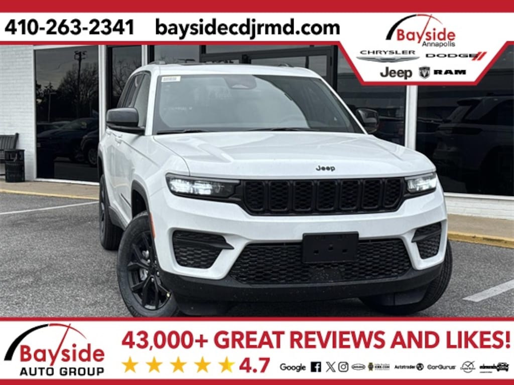 Bayside carries a full model lineup of Chrysler, Dodge, Jeep and RAM vehicles including the Jeep Grand Cherokee, Jeep Wrangler, Dodge Durango, Pacifica and RAM 1500. We invite you to shop around and compare our prices with other Chrysler, Dodge, Jeep and RAM dealerships in the Annapolis area. Let us know what you find, and let us give you our best price on the same model. We strive to earn your business and want you to be a Bayside Chrysler Dodge Jeep Ram customer for life! Visit us on the web at www.baysidecdjrmd.com. *Sale price includes all applicable rebates. Freight charge is not included. Taxes, tags and doc fee extra. Not all customers will qualify for all rebates. See dealer for details. Sale price includes all applicable rebates. Freight charge is not included. Taxes, tags and doc fee extra. Not all customers will qualify for all rebates. See dealer for details. Price includes: $1500 - 2025 National Stellantis Loyalty Retail Bonus Cash . Exp. 01/05/2026 $1500 - 2025 Northeast BC Retail Loyalty Retail Bonus Cash NCSM1 (DC,MD,VA Only). Exp. 01/05/2026 $2250 - 2025 National Retail Bonus Cash . Exp. 01/05/2026 $500 - 2025 National 2025 Military Bonus Cash. Exp. 01/05/2026