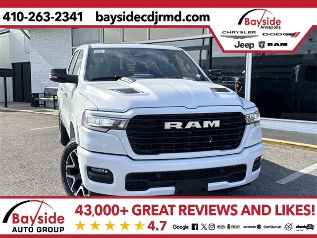 Bayside carries a full model lineup of Chrysler, Dodge, Jeep and RAM vehicles including the Jeep Grand Cherokee, Jeep Wrangler, Dodge Durango, Pacifica and RAM 1500. We invite you to shop around and compare our prices with other Chrysler, Dodge, Jeep and RAM dealerships in the Annapolis area. Let us know what you find, and let us give you our best price on the same model. We strive to earn your business and want you to be a Bayside Chrysler Dodge Jeep Ram customer for life! Visit us on the web at www.baysidecdjrmd.com. *Sale price includes all applicable rebates. Freight charge is not included. Taxes, tags and doc fee extra. Not all customers will qualify for all rebates. See dealer for details. Sale price includes all applicable rebates. Freight charge is not included. Taxes, tags and doc fee extra. Not all customers will qualify for all rebates. See dealer for details. Price includes: $1000 - 2026 Northeast BC Loyalty Retail Bonus Cash . Exp. 01/20/2026 $2000 - 2026 National SFS Lease Loyalty Bonus Cash . Exp. 02/02/2026 $3500 - 2026 National Retail Consumer Cash . Exp. 02/02/2026