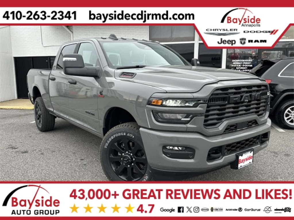 Bayside carries a full model lineup of Chrysler, Dodge, Jeep and RAM vehicles including the Jeep Grand Cherokee, Jeep Wrangler, Dodge Durango, Pacifica and RAM 1500. We invite you to shop around and compare our prices with other Chrysler, Dodge, Jeep and RAM dealerships in the Annapolis area. Let us know what you find, and let us give you our best price on the same model. We strive to earn your business and want you to be a Bayside Chrysler Dodge Jeep Ram customer for life! Visit us on the web at www.baysidecdjrmd.com. *Sale price includes all applicable rebates. Freight charge is not included. Taxes, tags and doc fee extra. Not all customers will qualify for all rebates. See dealer for details. Sale price includes all applicable rebates. Freight charge is not included. Taxes, tags and doc fee extra. Not all customers will qualify for all rebates. See dealer for details. Price includes: $1000 - 2026 National Bonus Cash . Exp. 01/05/2026 $500 - 2026 National 2026 Military Bonus Cash . Exp. 01/05/2026