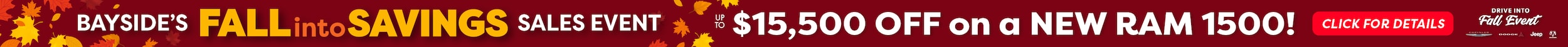 Bayside prices include all applicable rebates and incentives. Additional rebates and incentives, such as Military or College Graduate programs, may apply to those who qualify. All rebates and incentives are calculated based on our region. These programs may vary based on where you choose to register the vehicle. Price excludes title, tax, tags, registration, and $995 Dealer Processing fee. Any dealer installed options are additional where applicable. May require financing through Chrysler Financial and as such is subject to lender approval. Special finance rates offered from Chrysler for buyers with approved credit are in lieu of applicable customer cash rebates. Residency restrictions may apply. Bayside pricing may not be compatible with special factory financing. Bayside prices are valid based on manufacturer incentive program time periods, which vary by make. To receive the E-price, you must print and present this page to the sales team upon arrival. Offer not valid after completion of sale. All vehicles subject to prior sale. See dealer for further details. Some prices include retail trade assistance, see dealer for details.